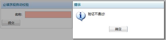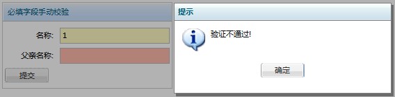 但是在一些特殊情况下,我们没有办法通过自动校验来完成。比如: 1.必填字段属于2个不同的dataSet,而提交的时候只提交其中1个 2.需要采用Aurora.request方法提交数据时 这个时候就需要采用手动校验。 手动校验通过调用dataSet的validate方法来完成校验,该方法返回一个boolean值,如果有未填项,会返回false。页面上的显示效果和自动校验相同,如下图点击“提交”按钮后的效果 大致代码如下: