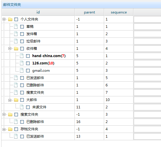 | [TreeGrid] ??2011-12-27 14:44:05by zq02 和tree类似,treeGrid需要指定父节点,显示的字段,和当前节点ID。但同时也集成了grid的一些特性,可以通过columns标签指定多个显示域,实例代码如下: <a:treeGrid showCheckBox="true" bindTarget="demo_ds" width="800" height="500" idField="id" style="border:none" parentField="parent"> <a:columns> <a:column name="name" prompt="id" width="250" renderer="mailrenderer" /> <a:column name="parent" prompt="parent" width="100"/> <a:column name="sequence" prompt="sequence" width="100"/> <a:column name="comment" prompt="comment" width="250" editor="tf" /> </a:columns> <a:editors> <a:textField id="tf" /> </a:editors> </a:treeGrid> 显示效果如下图: treeGrid的渲染方法和grid类似也是通过renderer来实现 treeGrid通过设置showCheckBox来实现节点的可选择性,方法和tree类似 Demo Attachments |