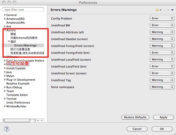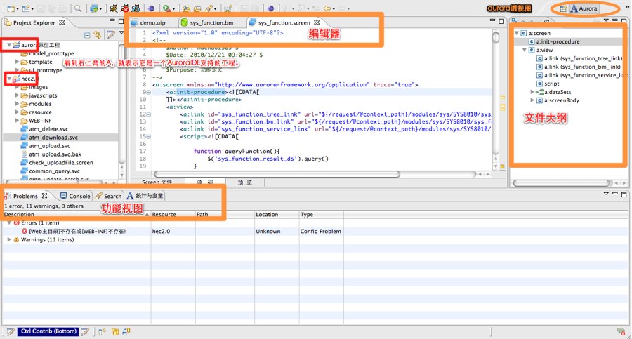 | Aurora IDE V1.3????2012-03-01 15:51:32by ??? IDE目前提供screen编辑器,bm编辑器,以及原型UI设计器(其他文档中会有详细介绍). 使用CTRL+SHIFT+F来可以格式化(可在源码编辑页面中任意位置使用)并且可以美化bm文件中的SQL文 . 如果不清楚某个标签的用法,可以将鼠标悬浮在标签上,编辑器负责解析并且提供这个标签的文档说明。 使用右键菜单中的,改名(F2快捷键),移动Action,Aurora IDE会将所有关联的地方一并修改掉。 建议在Finish前Preview一下,预览修改结果。 当然如果你对修改的结果不满意,可以CTRL+Z撤销掉或者将撤销的结果回复回来。 请预览一下重构后的结果 这是一个非常有用的功能可以帮助我们减少bug,及时发现问题。它是一个后台运行的程序,