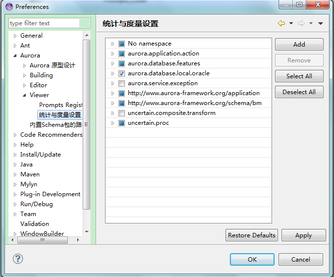 | Aurora IDE:??2013-06-21 13:02:49by wxjivm Table of Contents 使用该功能前需要先选择工程,之后左侧显示classes目录下所有文件夹,主视图显示左侧选中文件夹下的全部BM文件(包括子文件夹)。 1.查看Aurora工程的BM文件。 2.双击BM文件名可以打开BM编辑器。 3.拖动BM文件至Screen文件,可自动创建Form或Grid组件。 选择生成组件:Prompts视图用于查看、修改源文件字段的Prompt,并导出Sql注册脚本。 ●连接文件:选择要维护Prompts的文件。 ●打开原文件:打开文件源码。 ●新文件内容:生成新的文件。 ●中英文脚本:生成注册脚本。 统计视图用于统计Aurora工程各个文件的标签数量,脚本大小,文件大小和引用次数等,并且可以将结果存入数据库或从数据库读出,也可以导出到Excel。 统计视图如下,工具栏按钮依次为:选择文件、选择工程,导出到Excel,读取数据库保存结果和将结果保存到数据库。 1.统计之前需要选择文件或者选择一个Aurora工程。 选择将要统计的文件: 选择将要统计的Aurora工程: 选择完文件后程序开始统计,统计结果分为单个文件统计明细和所有文件汇总。 文件统计明细: ●统计结果显示文件名、路径、文件大小、脚本大小、标签数量、引用等。 ●在统计结果上方输入框输入文件名可以过滤统计结果,支持?(单个字符)和*(多字符)匹配符。 ●双击文件明细可以打开源码。 ●点击列头可以按升序或降序重新排列显示结果。 文件统计汇总: 汇总信息包括项目名称、资源库信息、所有文件统计值总和。 2.保存统计结果 将结果保存到数据库: “eclipse工程名”即Aurora项目名称,每个工程可以在数据库保存多次统计结果,以“项目名”区分。 3.读出数据库保存的结果 选择读取统计结果的Aurora项目。 选择项目。 读取统计结果如下图: Demo Attachments |
